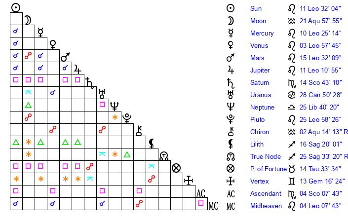 | Pluto | 25 Leo 58 | 2 Aquarius 20 | 28 Leo 2 |