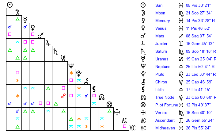 | Mercury | 14 Pisces 33 | 18 Pisces 51 | 12 Taurus 57 |