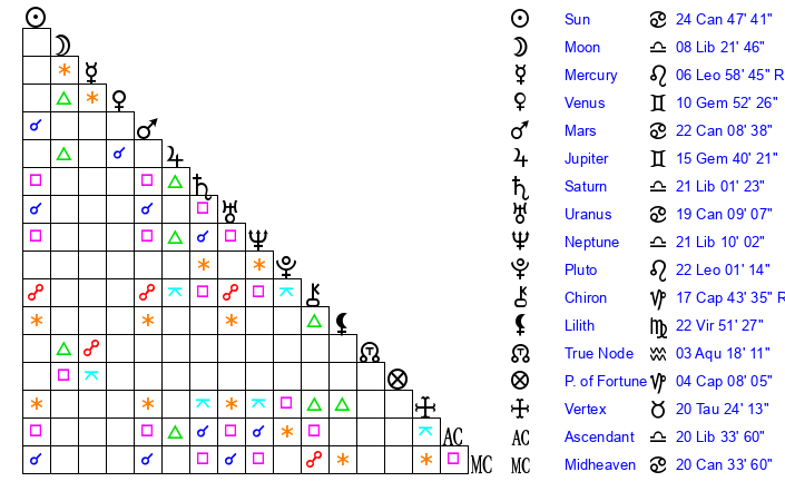 | Sun | 24 Cancer 47 | 25 Cancer 22 | 4 Libra 17 |