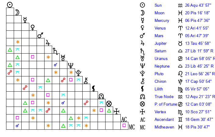 | Sun | 26 Aquarius 44 | 27 Aquarius 16 | 8 Taurus 6 |