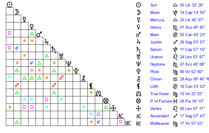 | Moon | 14 Capricorn 12 | 21 Sagittarius 31 | 5 Gemini 5 |