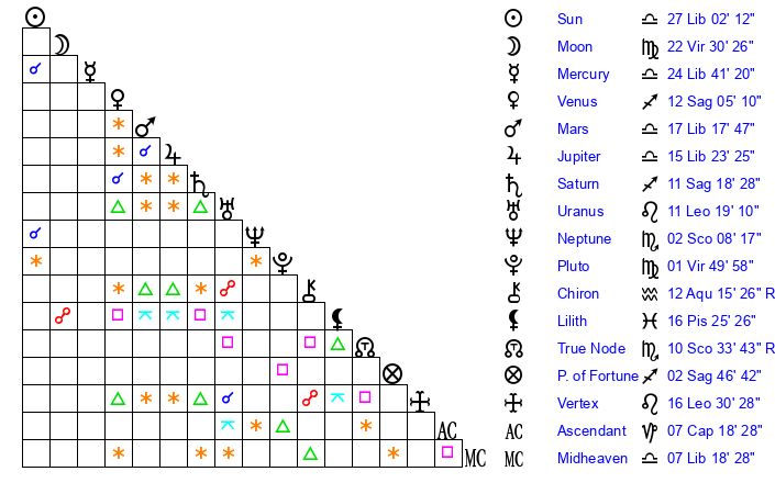 | Sun | 27 Libra 2 | 27 Libra 33 | 5 Capricorn 41 |