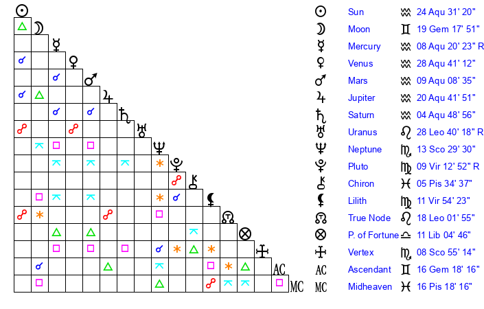 | Jupiter | 20 Aquarius 34 | 11 Gemini 25 | 4 Pisces 30 |