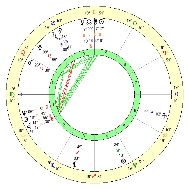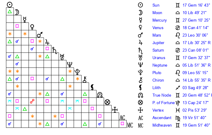 | Sun | 17 Gemini 17 | 18 Gemini 9 | 2 Virgo 50 |