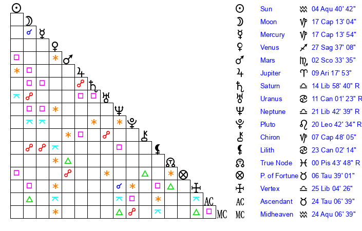 | Saturn | 15 Libra 30 | 16 Pisces 41 | 11 Libra 43 |