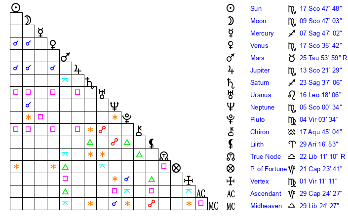 | Sun | 17 Scorpio 48 | 18 Scorpio 33 | 25 Capricorn 49 |