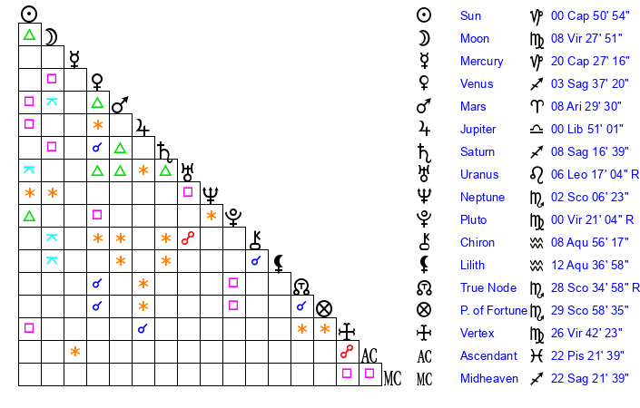 | Moon | 8 Virgo 15 | 28 Virgo 57 | 29 Aquarius 15 |