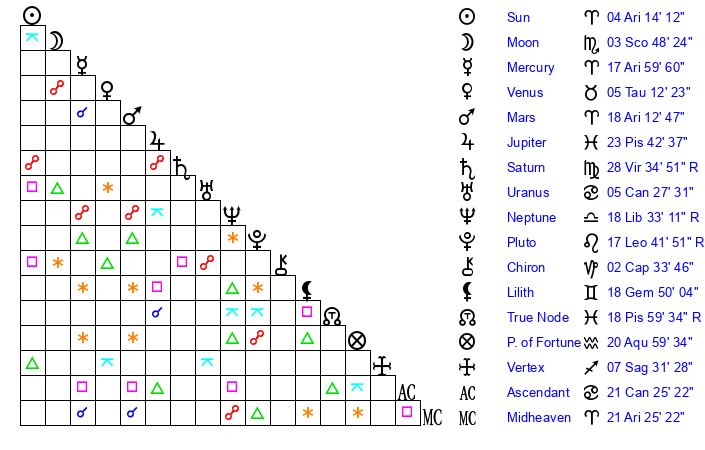 | Moon | 3 Scorpio 48 | 14 Aquarius 24 | 19 Cancer 1 |