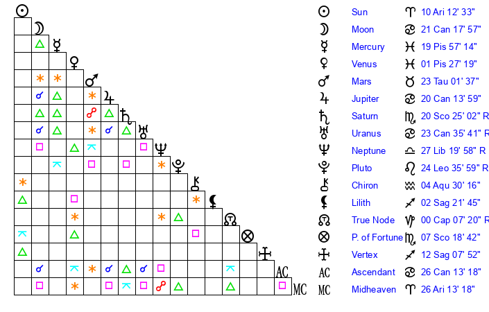 | Sun | 10 Aries 12 | 11 Aries 14 | 18 Gemini 4 |