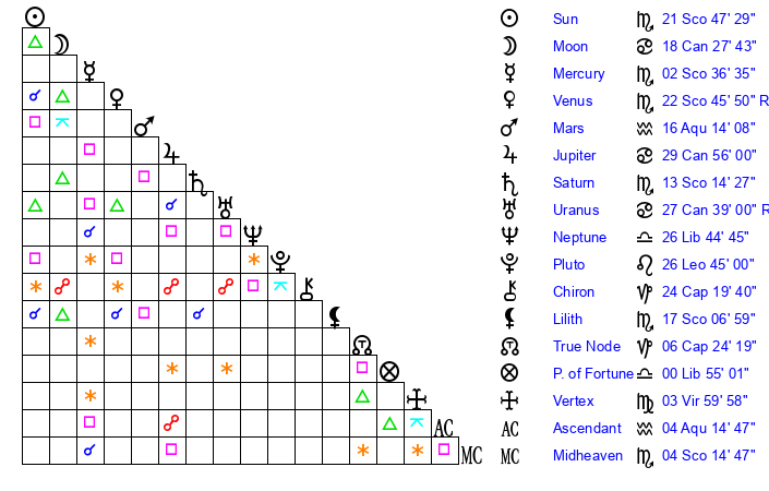 | Venus | 22 Scorpio 45 | 9 Scorpio 44 | 17 Sagittarius 6 |
