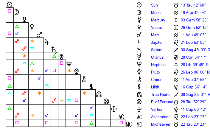 | Sun | 13 Taurus 13 | 13 Taurus 30 | 19 Cancer 20 |
