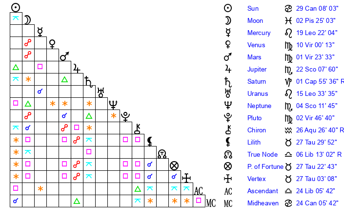 | Moon | 2 Pisces 24 | 2 Cancer 37 | 20 Cancer 47 |