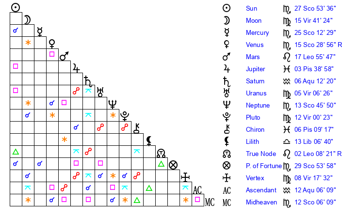 | Pluto | 12 Virgo 0 | 1 Aquarius 41 | 11 Virgo 47 |