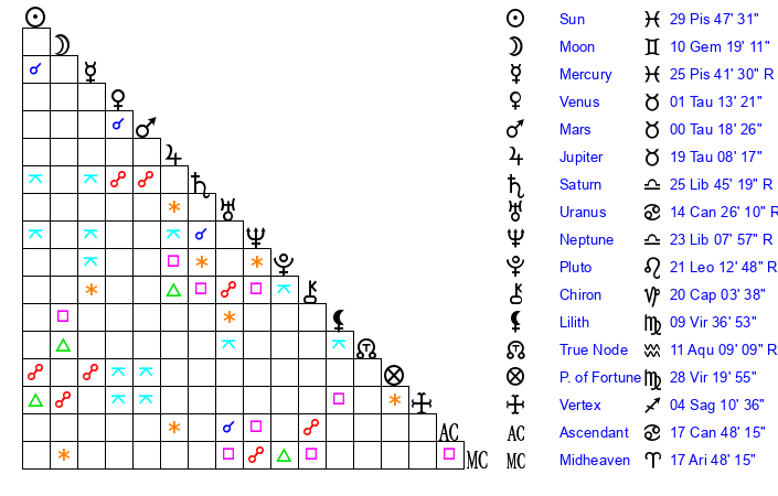 | Neptune | 23 Libra 7 | 29 Pisces 37 | 21 Libra 22 |