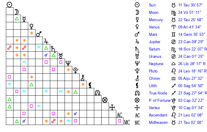 | Sun | 11 Taurus 30 | 12 Taurus 32 | 18 Cancer 36 |