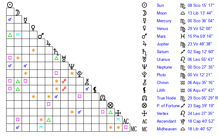 | Neptune | 0 Scorpio 28 | 29 Pisces 47 | 2 Scorpio 25 |