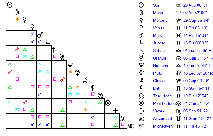 | Neptune | 19 Libra 25 | 28 Pisces 13 | 17 Libra 44 |