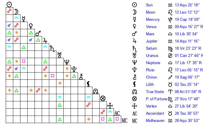 | Venus | 9 Aquarius 16 | 28 Pisces 52 | 12 Pisces 2 |