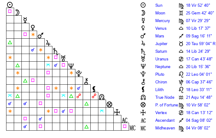 | Sun | 18 Virgo 53 | 19 Virgo 12 | 1 Sagittarius 22 |