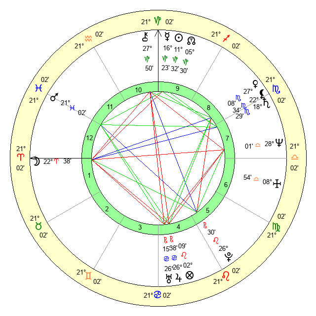 | Moon | 22 Aries 45 | 17 Aquarius 5 | 19 Scorpio 56 |