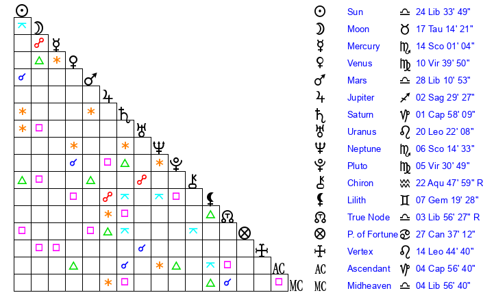 | Moon | 17 Taurus 13 | 24 Virgo 15 | 8 Libra 6 |