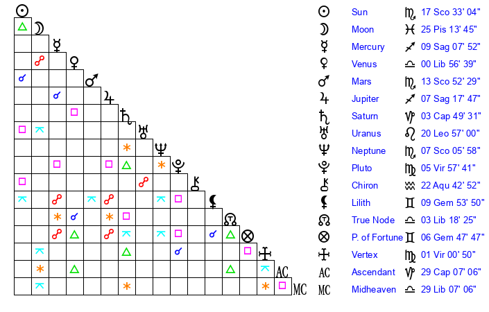 | Neptune | 7 Scorpio 5 | 29 Pisces 36 | 8 Scorpio 56 |