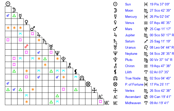| Sun | 19 Pisces 37 | 20 Pisces 22 | 25 Taurus 18 |