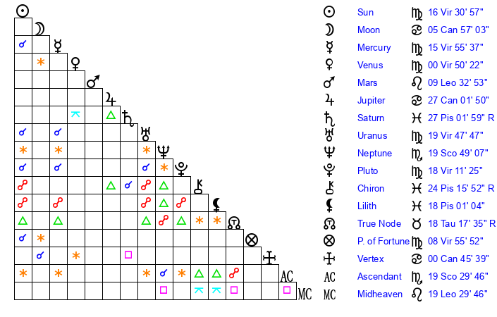 | Sun | 16 Virgo 31 | 17 Virgo 13 | 14 Scorpio 48 |