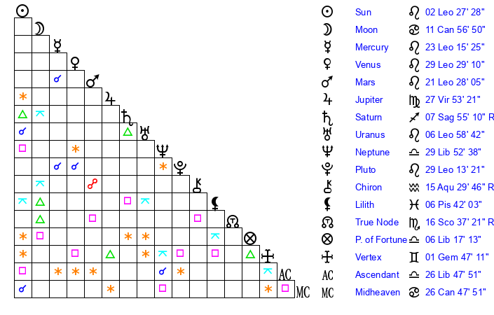| Sun | 2 Leo 27 | 3 Leo 0 | 8 Libra 14 |