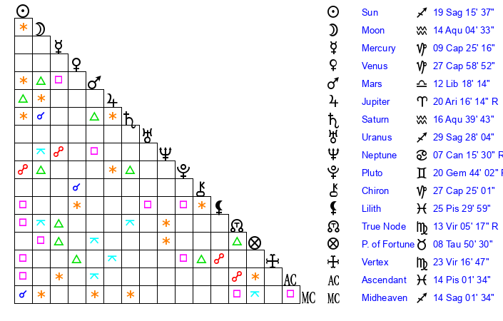 | Moon | 14 Aquarius 9 | 18 Virgo 1 | 6 Cancer 40 |