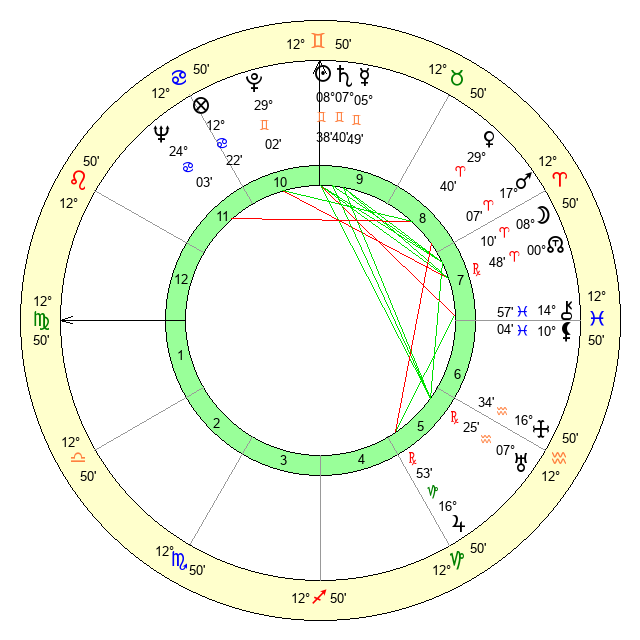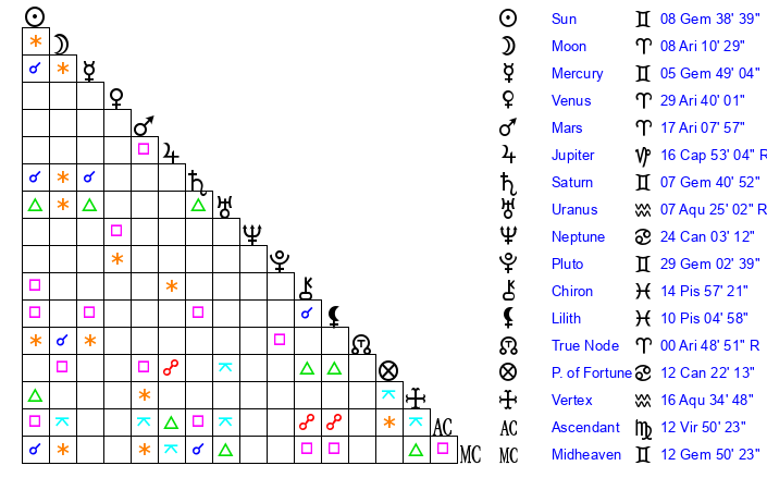 | Sun | 8 Gemini 39 | 9 Gemini 32 | 26 Virgo 8 |