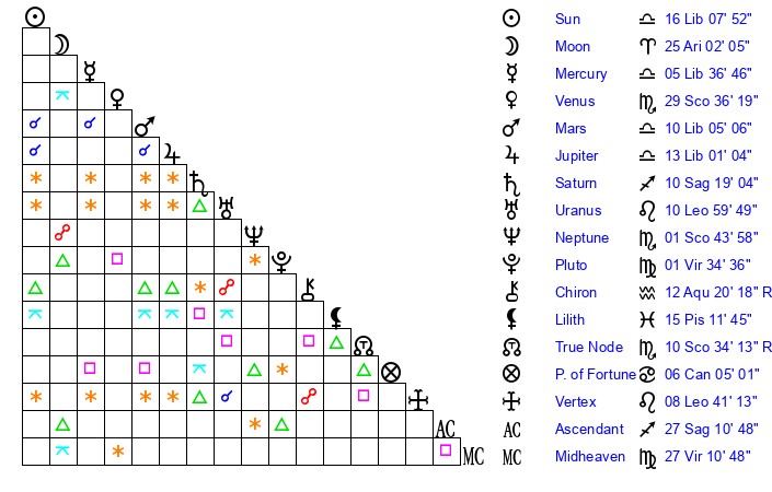 | Jupiter | 12 Libra 54 | 23 Cancer 27 | 26 Libra 16 |