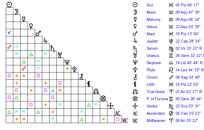 | Mercury | 9 Aquarius 4 | 18 Pisces 51 | 12 Gemini 2 |