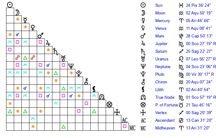 | Moon | 2 Aquarius 45 | 10 Libra 51 | 4 Cancer 12 |