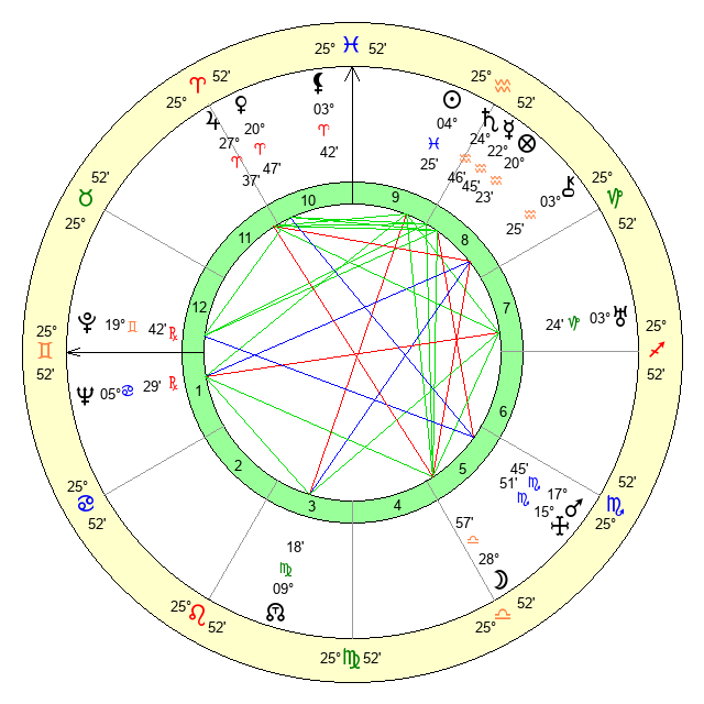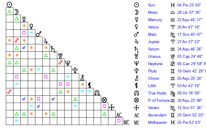 | Saturn | 25 Aquarius 11 | 19 Pisces 58 | 3 Pisces 17 |