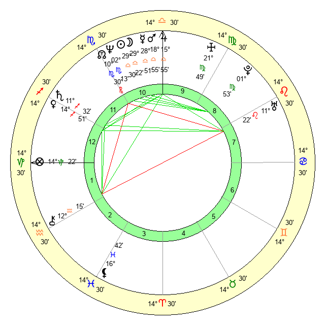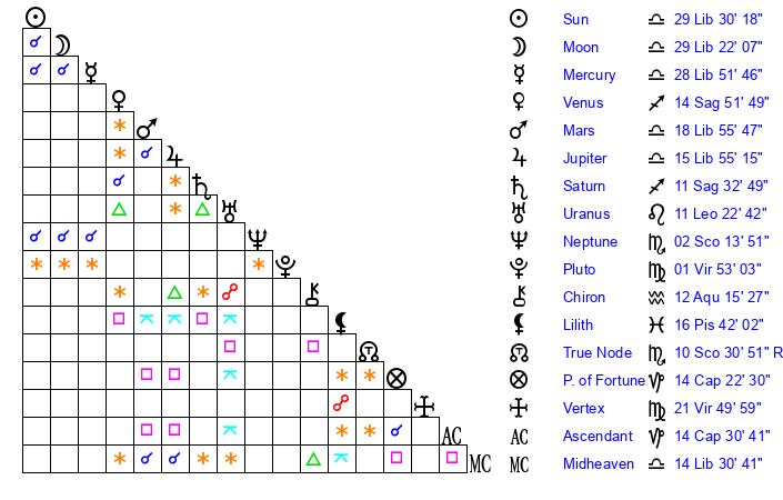 | Neptune | 2 Scorpio 14 | 29 Pisces 58 | 4 Scorpio 23 |