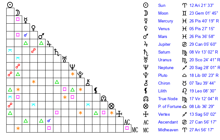 | Moon | 23 Gemini 6 | 12 Gemini 27 | 23 Aquarius 19 |