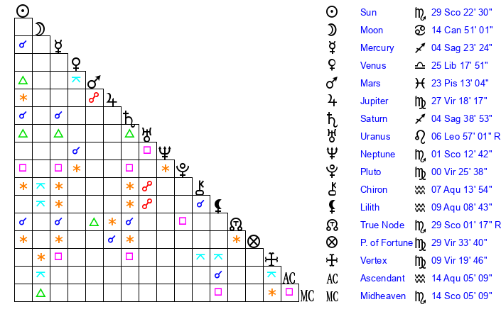 | Neptune | 1 Scorpio 13 | 29 Pisces 27 | 2 Scorpio 35 |