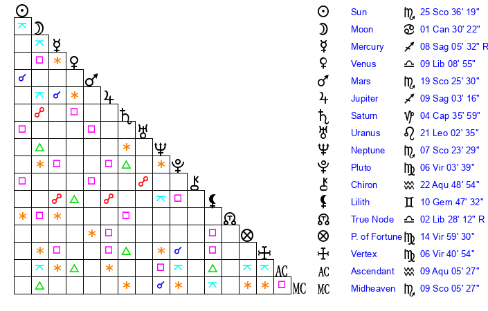 | Sun | 25 Scorpio 36 | 26 Scorpio 36 | 2 Aquarius 42 |