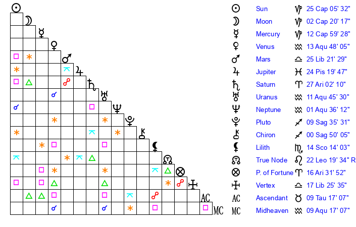 Sun | 25 Capricorn 6 | 25 Capricorn 48 | 21 Aquarius 31 |