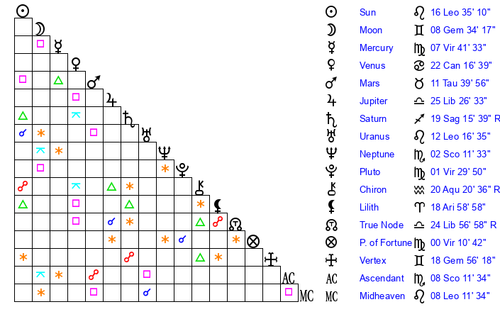 | Moon | 8 Gemini 26 | 22 Aquarius 9 | 1 Sagittarius 37 |