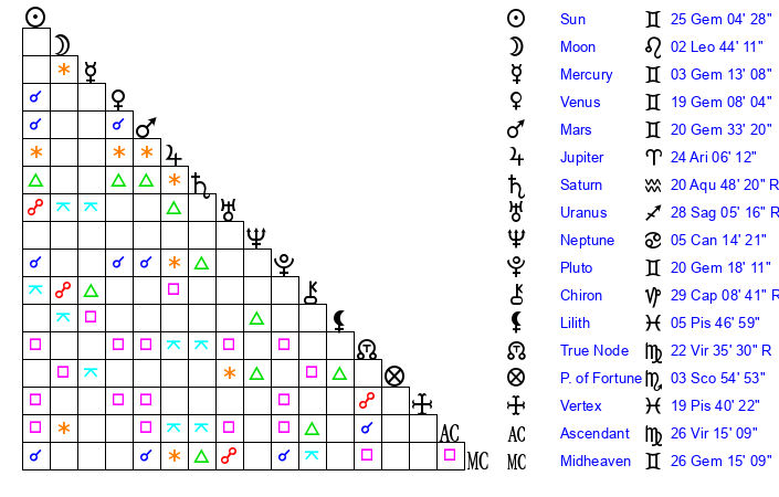 | Pluto | 20 Gemini 19 | 3 Aquarius 24 | 21 Gemini 38 |