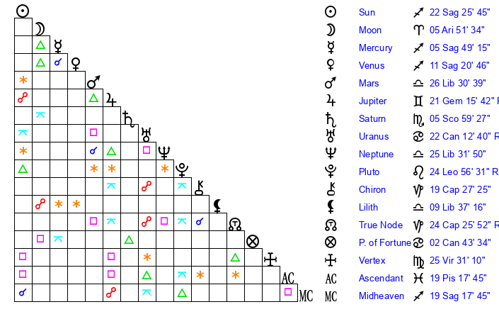 | Sun | 22 Sagittarius 25 | 22 Sagittarius 57 | 5 Pisces 33 |