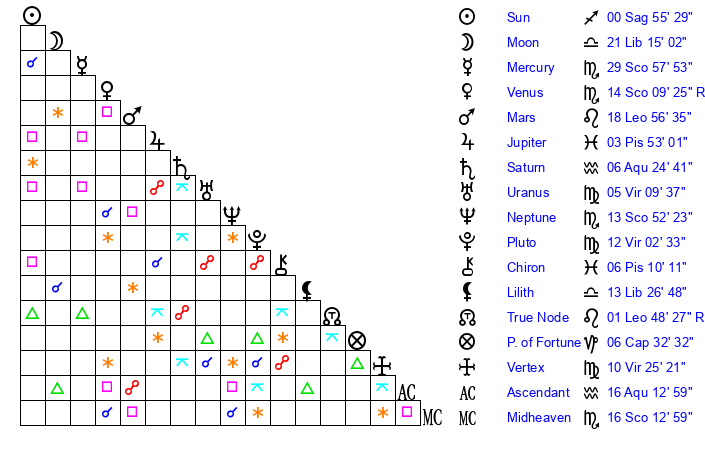 | Sun | 0 Sagittarius 56 | 1 Sagittarius 39 | 5 Aquarius 1 |