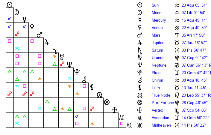 | Sun | 23 Aquarius 6 | 24 Aquarius 14 | 19 Gemini 50 |