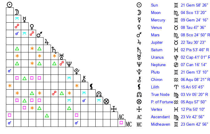 | Pluto | 21 Gemini 14 | 3 Aquarius 27 | 22 Gemini 41 |