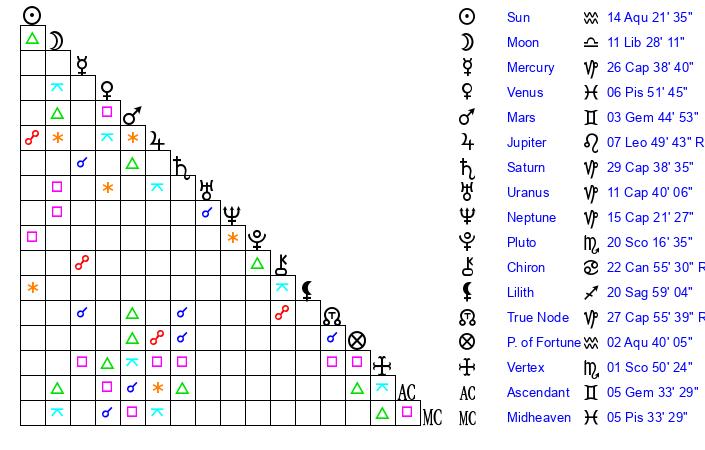 Sun | 14 Aquarius 21 | 15 Aquarius 7 | 18 Pisces 37 |