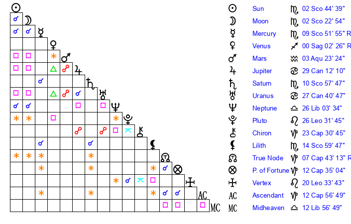 | Saturn | 11 Scorpio 25 | 25 Pisces 57 | 19 Scorpio 12 |
