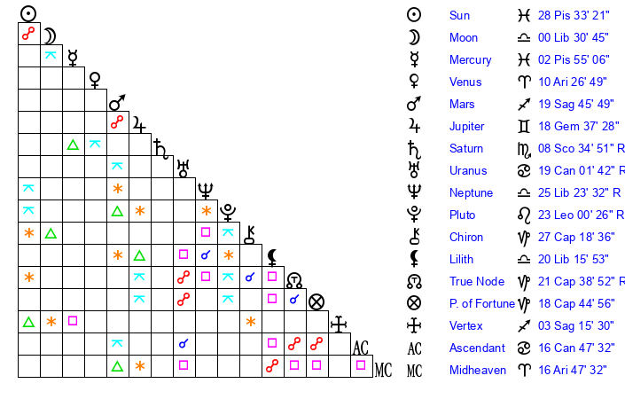 | Neptune | 25 Libra 23 | 29 Pisces 35 | 23 Libra 37 |
