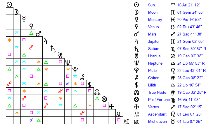 | Sun | 16 Aries 21 | 17 Aries 8 | 24 Gemini 59 |